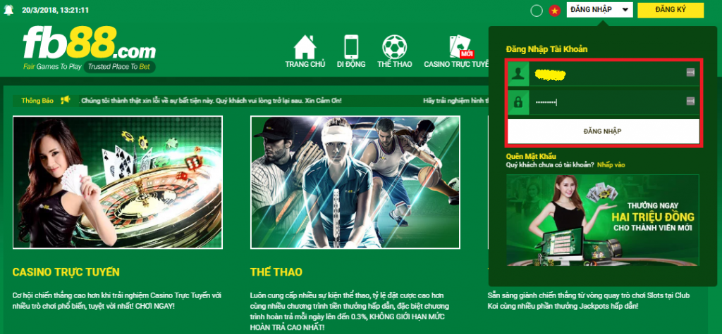 Bước 1: Đăng Nhập Tài Khoản Tham Gia Chơi Tại FB88.COM Và Thực Hiện Chuyển Tiền