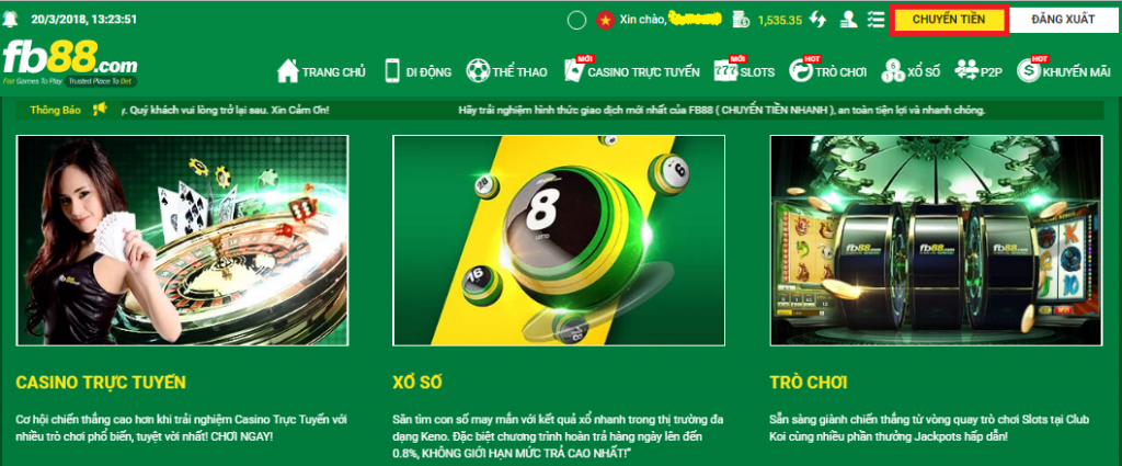 Chọn thực hiện chuyển tiền tại FB88.COM