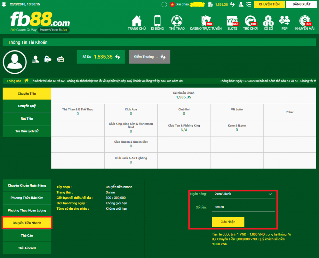 Chọn phương thức chuyển tiền nhanh, chọn ngân hàng, nhập số tiền muốn chuyển khoản và tài khoản FB88.COM và xác nhận giao dịch
