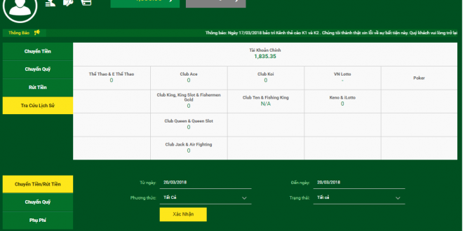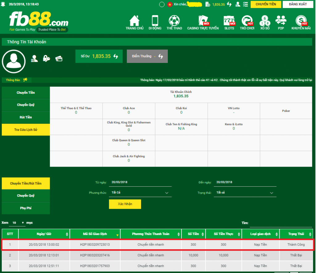 Tra cứu lịch sử chuyển tiền thành công tại tài khoản FB88.COM
